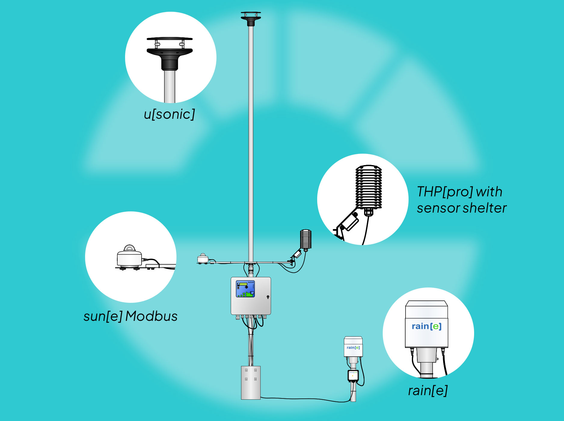 The AEM Apex Automated Weather Station is equipped with a complete set of advanced sensors to capture critical weather parameters with precision. Precipitation is measured with the rain[e] weighing precipitation sensor, while wind direction and speed are captured by the [u]sonic wind sensor. Solar radiation is monitored using the sun[e] pyranometer, and the all-new THP[pro] delivers accurate measurements for temperature, humidity, and pressure. Data from all these sensors is seamlessly collected and managed by the ser[LOG] data logger, which offers flexible integration and secure communication for diverse measurement applications.